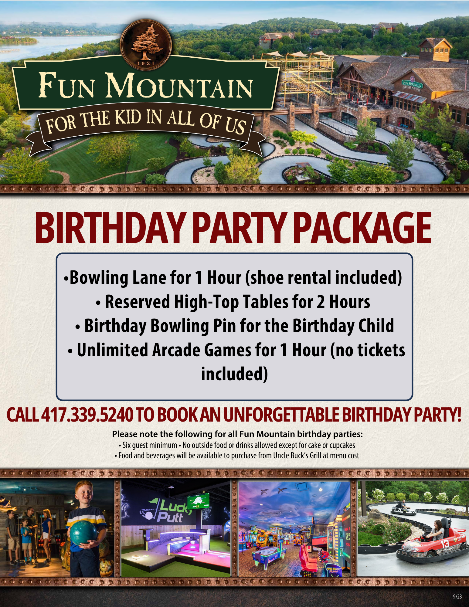The Fun Mountain Birthday Party Package includes an exclusive bowling lane, reserved high-top tables, and so much more! Celebrate with your loved ones at Big Cedar Lodge's Fun Mountain!