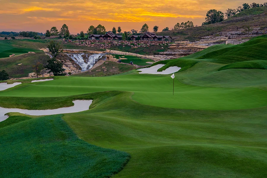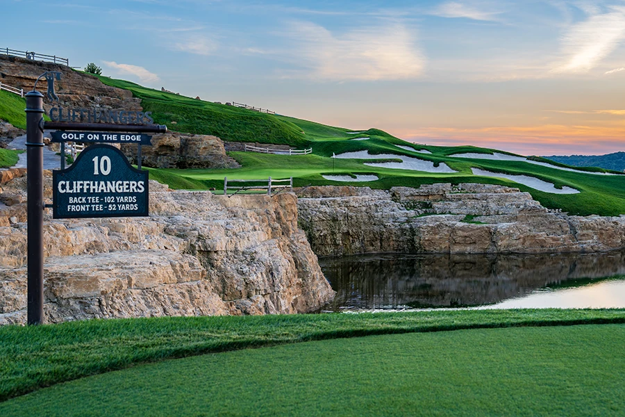 The Ozarks National Practice Facility is accessible for guests playing on Ozarks National, Payne’s Valley, Top of the Rock, Cliffhangers and Mountain Top. The practice area features two putting greens, a three-green short game area with sand bunkers, and a driving range featuring Zoysia Grass and artificial hitting surfaces. To prepare your game for the challenge of Ozarks National, the greens are all situated above or below the hitting area, similar to what you will see out on the course.