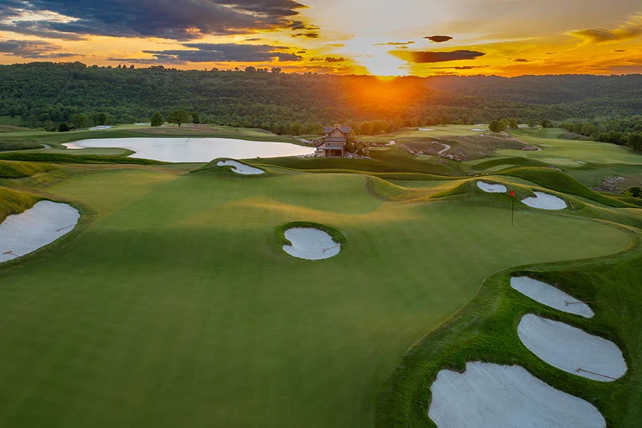 Originally designed to be the Payne’s Valley driving range, Johnny and JP Morris begin walking the land and daydreaming about a new par 3 course on the side of a limestone cliff. After just a month of planning, excavators start moving dirt.